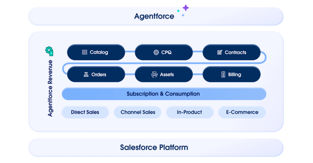 Agentforce is Salesforce’s execution framework for AI agents operating across CRM workflows. It is not a product that replaces existing clouds. It is a coordination layer that allows AI agents to act inside defined systems, using governed data and rules. Agentforce Revenue Management sits inside this ecosystem as the revenue execution domain. It owns how money is configured, committed, billed, and measured.