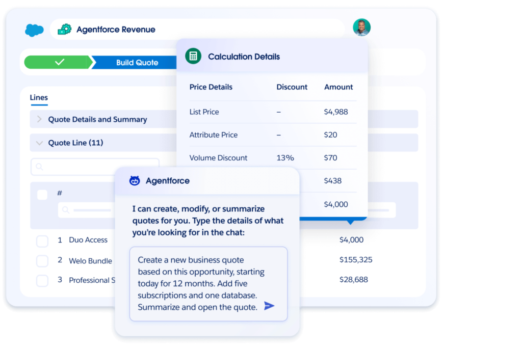 Let’s suppose your organisation manages subscription and usage-based revenue across direct and digital channels. Agentforce Revenue Management acts as the single revenue control layer on Salesforce CRM. The platform applies shared product data, pricing logic, contract rules, and billing structure across every revenue action. AI agents operate inside this layer to execute revenue tasks with accuracy and consistency.