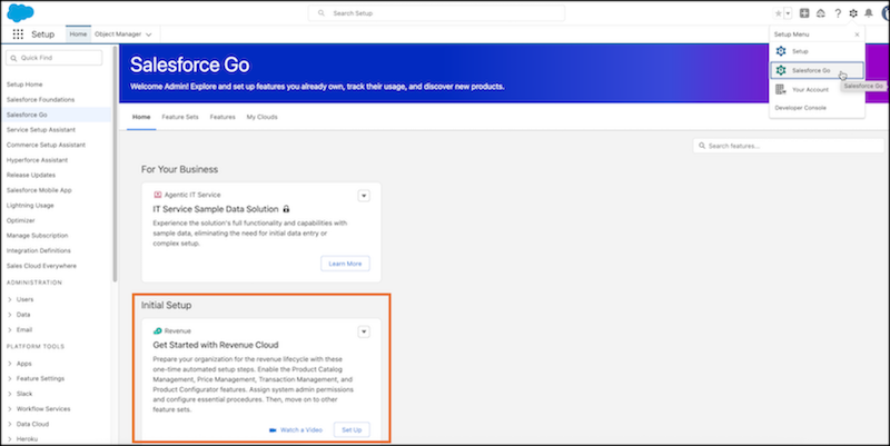 Salesforce Go operates through Salesforce Setup and provides the controlled entry point for Revenue Cloud Advanced enablement. Access begins through the admin interface that governs security, data, and configuration so every Revenue Cloud action remains under platform governance.