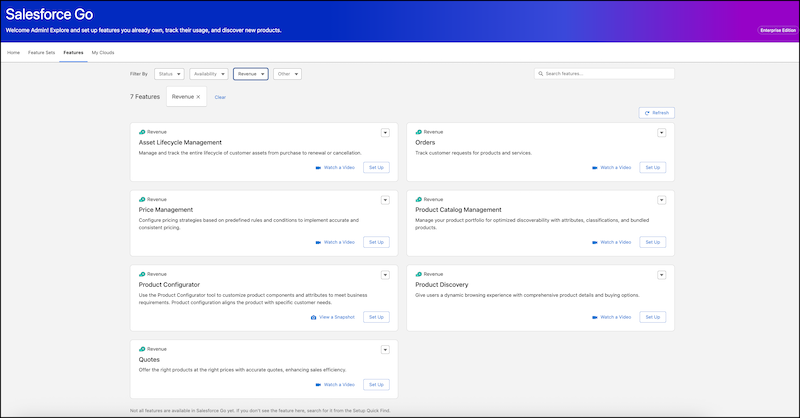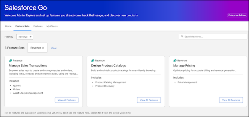 • Feature discovery. Salesforce Go shows every Revenue Cloud feature and feature set that the Salesforce edition and licenses support. Admins can see which RCA capabilities are available before any activation begins.